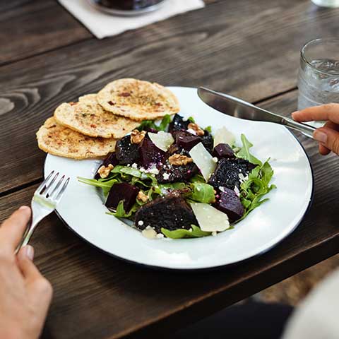 großer Salatteller mit Salaten der Saison, belegt mit Hähnchen oder Putenstreifen, Kresse und Kräuterdressing, Knoblauchbrötchen