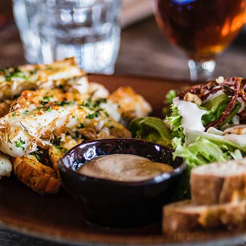 belegt mit Zwiebeln, dazu Remoulade oder Vinaigrette auf hausgemachten Bratkartoffeln, mit Salatgarnitur der Saison